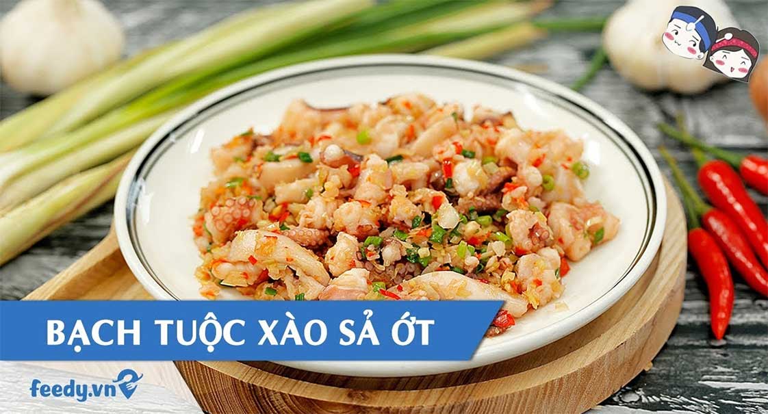 - Xào: phi thơm sả – tỏi – ớt; lửa lớn; đảo bạch tuộc 1–2 phút; rưới xốt; thêm hành tây; tắt bếp; rắc hành lá/tiêu.