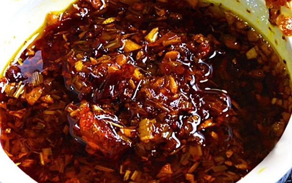 - Đun nóng dầu ăn cho sả vào đầu tiên khi sả hơi se lại thì cho tỏi vào, khi tỏi hơi vàng thì cho ớt tươi, đảo hỗn hợp trên chảo một lúc sau thì cho ớt khô vào và cuối cùng là tôm khô đã băm nhuyễn đảo đều tay khi hỗn hợp hơi sệt lại thì cho 1,5 thìa đường và ½ thìa muối vào đảo đều để lửa rêu rêu một chút thì tắt bếp
